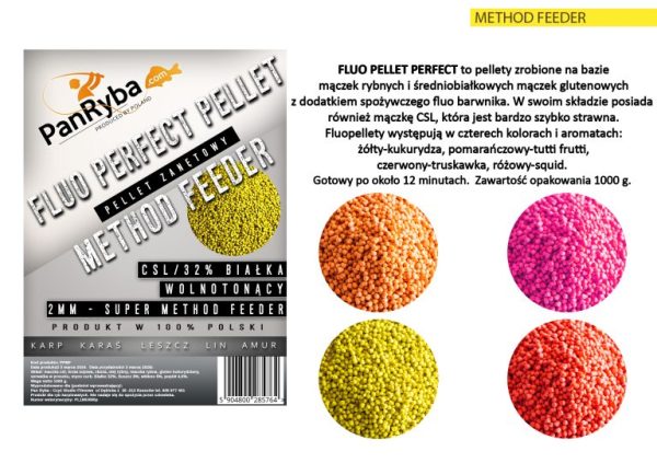 Fluo pellet to pellety 2 mm zrobione z mączek średnio białkowych z dodatkiem spożywczego barwnika fluo. Pracują bardzo dobrze, obsypują się szybko. Idealnie maskują przynętę w podobnym kolorze. Zalecamy domaczać wodą lub zalać na około 60 sekund. Pełną gotowość do użycia uzyskuje po 20 minutach. Zawartość opakowania 1000 g.