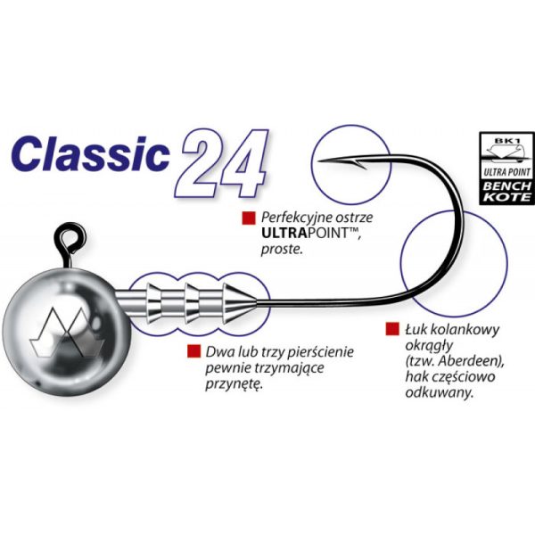 Klasyczna seria główek jigowych, oparta na najwyższej jakości hakach ULTRAPOINT™, pokrywanych policeramiczną powłoką BK1 BenchKote. Jego cechy to okrągły łuk kolankowy typu Aberdeen i długie, proste ostrze. W celu zwiększenia wytrzymałości, środkowa część trzonka oraz łuk kolankowy zostały spłaszczone bocznie (tzw. semi-forged hook, czyli hak częściowo odkuwany). W konstrukcji główki zastosowano najnowocześniejszy obecnie system talerzowego blokowania przynęty, który w stu procentach zabezpiecza przynętę przed zsuwaniem się w czasie rzutu. Główki CLASSIC nadają się do zbrojenia wszelkiego rodzaju przynęt gumowych w rozmiarach 4–15 centymetrów, w przypadku tych największych zaleca się stosowanie dwuhaczykowej kotwiczki typu 3674R, jako tzw. dozbrojki.