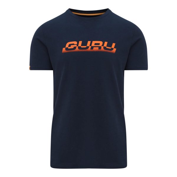 Lekki, granatowy t-shirt z krótkim rękawem, z przecięciem graficznym Guru z przodu i dużą granatową grafiką Guru z tyłu.
