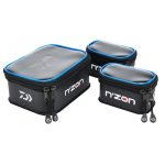 Zestaw pojemników na akcesoria Daiwa N'zon EVA składa się z trzech pojemników do przechowywania różnych przynęt, robaków, pelletu itp. Pojemniki wyposażone we wzmocniony rant i dekiel oraz zamek błyskawiczny. Oba mniejsze pojemniki mieszczą się w jednym większym.