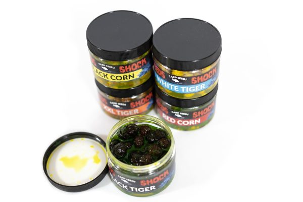 Seeds Shock – Produkt stworzony, aby wyznaczać nowy poziom skuteczności w łowieniu ryb. Wyselekcjonowaliśmy 2 rodzaje kukurydzy i 3 rodzaje orzechów tygrysich. Ugotowane ziarna zalane specjalnym liquidem, od razu po spadnięciu na dno wytwarzają wokół siebie wizualną i zapachową smugę dymu, która rozprowadza się na całą wysokość wody i ściąga ryby w nęcisko. Produkty te idealnie sprawdzą się na włos, do materiałów PVA, w trudnych warunkach żerowania czy podczas krótkich zasiadek.