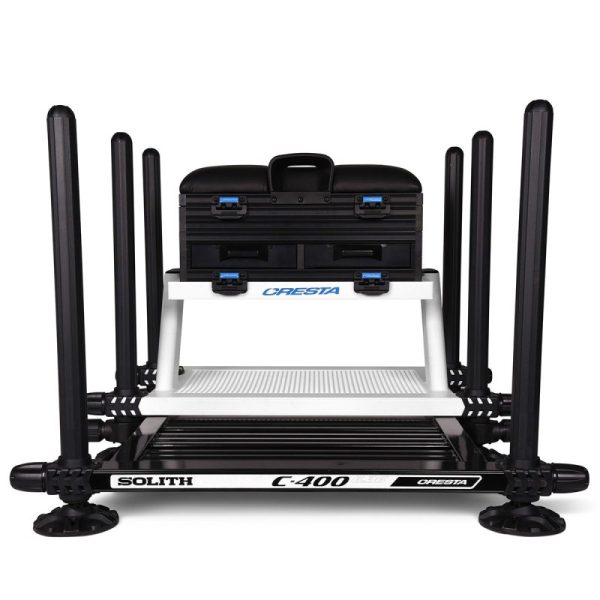 Kosz Solith C400 oferuje komfort i funkcje wymagane zarówno przez wędkarzy łowiących na wędki stałe, jak i feeder. Został zaprojektowany tak, aby zapewnić optymalną równowagę między stabilnością, wytrzymałością i wagą, czego efektem jest lekkie 6-nożne pudełko. Poduszka siedziska ma miękką górną warstwę i twardszą wyściółkę od spodu. Rezultatem jest urządzenie, które jest wygodne i przyjemne w użyciu przez długi czas. Wgłębienie pozwala na centralne podparcie korpusu. Model C400 posiada schowek pod siedziskiem na przypony i spławiki. Jest też szuflada boczna i 2 szuflady przednie z zamkami magnetycznymi. Dolna część ramy jest uszczelniona podłogą klatkową, tworząc dodatkowy wentylowany schowek. Półka jest przymocowana do ramy za pomocą 4 klipsów i w razie potrzeby można ją całkowicie zdemontować. Wytrzymała, lekka aluminiowa rama jest wyposażona w regulowaną platformę, a jej przemyślana konstrukcja umożliwia ustawienie jej bardzo nisko nad ziemią. Nogi o średnicy 36 mm gwarantują dużą stabilność na każdej wysokości. Cztery z sześciu nóg są teleskopowe, a wszystkie mają pochyłą górę i odchylane stopki przeciwbłotne. Dzięki systemowi niebrudzącemu 360º nogi można zamocować na dowolnej wysokości. Stała poziomica gwarantuje idealne pozycjonowanie. Dno jest wyposażone w podstawę Cage, na której można umieszczać przedmioty podczas transportu i łowienia. Wyściełany pasek na ramię zapewnia wygodę noszenia, a 2 podpórki w komorze zapewniają optymalną równowagę podczas transportu. Pasek jest również wyposażony w 2 klipsy, dzięki czemu w razie potrzeby można zdjąć cały pasek. Ergonomiczne pokrętła zarówno na ramie, jak i na nogach zapewniają optymalną przyczepność dla łatwego i bezpiecznego pozycjonowania. Jeśli wymagane jest więcej miejsca do przechowywania lub dodatkowa wysokość, można dodać jednostkę o wysokości 40 mm. Dostępny w czarnym i białym lakierze.