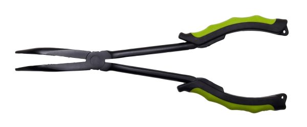 Długie szczypce do odhaczania ryb (28cm), wykonane z wysokowęglowej stali, z dodatkową powłoką PTFE. Posiadają zakrzywione szczęki, idealne do wygodnego sięgania i wyhaczania przynęt schowanych głęboko w pysku ryby. Antypoślizgowe uchwyty.